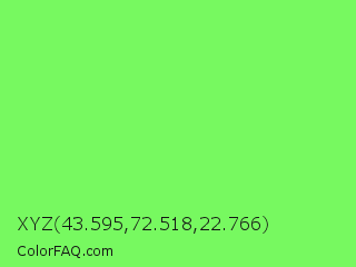 XYZ 43.595,72.518,22.766 Color is a light green color and the nearest color is Screamin Green #66ff66. Hex code #77f960 and RGB value is rgb(119,249,96). In RGB color space, this color is composed of 47% red, 98% green, 38% blue, In CMYK color space, this color is composed of 52% cyan, 0% magenta, 61% yellow , 2% black , In HSL color space, this color has a hue angle of 111° , 93% saturation and 68% lightness.