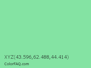 XYZ 43.596,62.488,44.414 Color is a light green color and the nearest color is Vista Blue #8fd6b4. Hex code #84e3a3 and RGB value is rgb(132,227,163). In RGB color space, this color is composed of 52% red, 89% green, 64% blue, In CMYK color space, this color is composed of 42% cyan, 0% magenta, 28% yellow , 11% black , In HSL color space, this color has a hue angle of 140° , 63% saturation and 70% lightness.