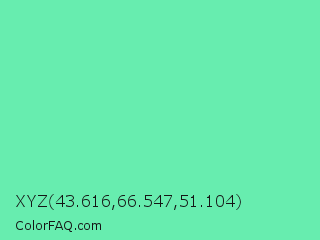 XYZ 43.616,66.547,51.104 Color is a light green color and the nearest color is Medium Aquamarine #66ddaa. Hex code #67edaf and RGB value is rgb(103,237,175). In RGB color space, this color is composed of 40% red, 93% green, 69% blue, In CMYK color space, this color is composed of 57% cyan, 0% magenta, 26% yellow , 7% black , In HSL color space, this color has a hue angle of 152° , 79% saturation and 67% lightness.