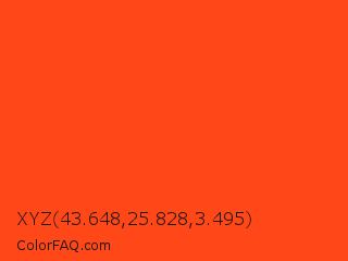 XYZ 43.648,25.828,3.495 Color is a normal red color and the nearest color is Orioles Orange #fb4f14. Hex code #ff4717 and RGB value is rgb(255,71,23). In RGB color space, this color is composed of 100% red, 28% green, 9% blue, In CMYK color space, this color is composed of 0% cyan, 72% magenta, 91% yellow , 0% black , In HSL color space, this color has a hue angle of 12° , 100% saturation and 55% lightness.
