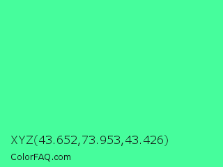 XYZ 43.652,73.953,43.426 Color is a light green color and the nearest color is Eucalyptus #44d7a8. Hex code #46fd9c and RGB value is rgb(70,253,156). In RGB color space, this color is composed of 27% red, 99% green, 61% blue, In CMYK color space, this color is composed of 72% cyan, 0% magenta, 38% yellow , 1% black , In HSL color space, this color has a hue angle of 148° , 98% saturation and 63% lightness.