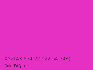 XYZ 43.654,22.922,54.348 Color is a normal magenta color and the nearest color is Razzle Dazzle Rose #ff33cc. Hex code #e630c4 and RGB value is rgb(230,48,196). In RGB color space, this color is composed of 90% red, 19% green, 77% blue, In CMYK color space, this color is composed of 0% cyan, 79% magenta, 15% yellow , 10% black , In HSL color space, this color has a hue angle of 311° , 78% saturation and 55% lightness.