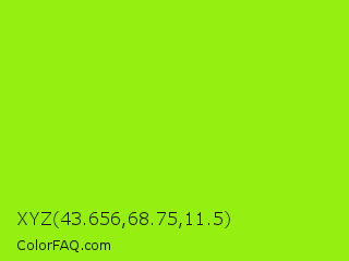 XYZ 43.656,68.75,11.5 Color is a normal green color and the nearest color is Spring Bud #a7fc00. Hex code #95f011 and RGB value is rgb(149,240,17). In RGB color space, this color is composed of 58% red, 94% green, 7% blue, In CMYK color space, this color is composed of 38% cyan, 0% magenta, 93% yellow , 6% black , In HSL color space, this color has a hue angle of 84° , 88% saturation and 50% lightness.