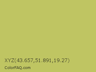XYZ 43.657,51.891,19.27 Color is a normal yellow color and the nearest color is Celery #b8c25d. Hex code #bfc562 and RGB value is rgb(191,197,98). In RGB color space, this color is composed of 75% red, 77% green, 38% blue, In CMYK color space, this color is composed of 3% cyan, 0% magenta, 50% yellow , 23% black , In HSL color space, this color has a hue angle of 64° , 46% saturation and 58% lightness.