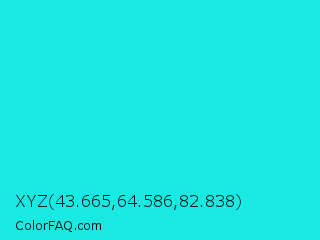 XYZ 43.665,64.586,82.838 Color is a normal cyan color and the nearest color is Bright Turquoise #08e8de. Hex code #18eae3 and RGB value is rgb(24,234,227). In RGB color space, this color is composed of 9% red, 92% green, 89% blue, In CMYK color space, this color is composed of 90% cyan, 0% magenta, 3% yellow , 8% black , In HSL color space, this color has a hue angle of 178° , 83% saturation and 51% lightness.