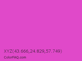 XYZ 43.666,24.829,57.749 Color is a normal magenta color and the nearest color is Steel Pink #cc33cc. Hex code #e049c9 and RGB value is rgb(224,73,201). In RGB color space, this color is composed of 88% red, 29% green, 79% blue, In CMYK color space, this color is composed of 0% cyan, 67% magenta, 10% yellow , 12% black , In HSL color space, this color has a hue angle of 309° , 71% saturation and 58% lightness.