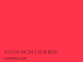 XYZ 43.66,24.122,8.833 Color is a normal red color and the nearest color is Red Salsa #fd3a4a. Hex code #ff334a and RGB value is rgb(255,51,74). In RGB color space, this color is composed of 100% red, 20% green, 29% blue, In CMYK color space, this color is composed of 0% cyan, 80% magenta, 71% yellow , 0% black , In HSL color space, this color has a hue angle of 353° , 100% saturation and 60% lightness.