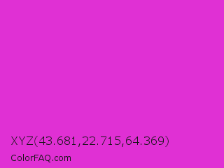 XYZ 43.681,22.715,64.369 Color is a normal magenta color and the nearest color is Steel Pink #cc33cc. Hex code #e030d4 and RGB value is rgb(224,48,212). In RGB color space, this color is composed of 88% red, 19% green, 83% blue, In CMYK color space, this color is composed of 0% cyan, 79% magenta, 5% yellow , 12% black , In HSL color space, this color has a hue angle of 304° , 74% saturation and 53% lightness.
