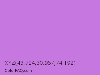 XYZ 43.724,30.957,74.192 Color is a light purple color and the nearest color is French Mauve #d473d4. Hex code #c778e0 and RGB value is rgb(199,120,224). In RGB color space, this color is composed of 78% red, 47% green, 88% blue, In CMYK color space, this color is composed of 11% cyan, 46% magenta, 0% yellow , 12% black , In HSL color space, this color has a hue angle of 286° , 63% saturation and 67% lightness.