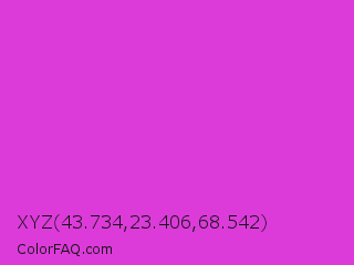XYZ 43.734,23.406,68.542 Color is a normal magenta color and the nearest color is Steel Pink #cc33cc. Hex code #dc3bda and RGB value is rgb(220,59,218). In RGB color space, this color is composed of 86% red, 23% green, 85% blue, In CMYK color space, this color is composed of 0% cyan, 73% magenta, 1% yellow , 14% black , In HSL color space, this color has a hue angle of 301° , 70% saturation and 55% lightness.