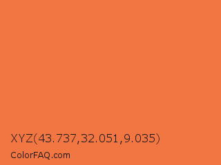 XYZ 43.737,32.051,9.035 Color is a normal orange color and the nearest color is Mandarin #f37a48. Hex code #f17642 and RGB value is rgb(241,118,66). In RGB color space, this color is composed of 95% red, 46% green, 26% blue, In CMYK color space, this color is composed of 0% cyan, 51% magenta, 73% yellow , 5% black , In HSL color space, this color has a hue angle of 18° , 86% saturation and 60% lightness.