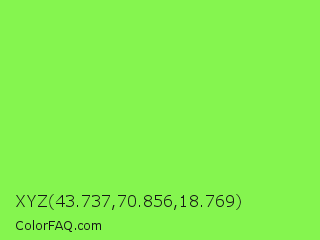 XYZ 43.737,70.856,18.769 Color is a light green color and the nearest color is Kiwi #8ee53f. Hex code #85f54f and RGB value is rgb(133,245,79). In RGB color space, this color is composed of 52% red, 96% green, 31% blue, In CMYK color space, this color is composed of 46% cyan, 0% magenta, 68% yellow , 4% black , In HSL color space, this color has a hue angle of 100° , 89% saturation and 64% lightness.