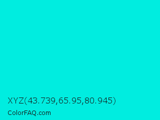XYZ 43.739,65.95,80.945 Color is a normal cyan color and the nearest color is Bright Turquoise #08e8de. Hex code #00ede0 and RGB value is rgb(0,237,224). In RGB color space, this color is composed of 0% red, 93% green, 88% blue, In CMYK color space, this color is composed of 100% cyan, 0% magenta, 5% yellow , 7% black , In HSL color space, this color has a hue angle of 177° , 100% saturation and 46% lightness.