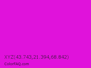 XYZ 43.743,21.394,68.842 Color is a normal magenta color and the nearest color is Deep Magenta #cc00cc. Hex code #e012db and RGB value is rgb(224,18,219). In RGB color space, this color is composed of 88% red, 7% green, 86% blue, In CMYK color space, this color is composed of 0% cyan, 92% magenta, 2% yellow , 12% black , In HSL color space, this color has a hue angle of 301° , 85% saturation and 47% lightness.