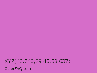 XYZ 43.743,29.45,58.637 Color is a light magenta color and the nearest color is French Mauve #d473d4. Hex code #d66dc9 and RGB value is rgb(214,109,201). In RGB color space, this color is composed of 84% red, 43% green, 79% blue, In CMYK color space, this color is composed of 0% cyan, 49% magenta, 6% yellow , 16% black , In HSL color space, this color has a hue angle of 307° , 56% saturation and 63% lightness.