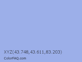XYZ 43.748,43.611,83.203 Color is a light blue color and the nearest color is Maximum Blue Purple #acace6. Hex code #9cafe9 and RGB value is rgb(156,175,233). In RGB color space, this color is composed of 61% red, 69% green, 91% blue, In CMYK color space, this color is composed of 33% cyan, 25% magenta, 0% yellow , 9% black , In HSL color space, this color has a hue angle of 225° , 64% saturation and 76% lightness.