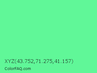 XYZ 43.752,71.275,41.157 Color is a light green color and the nearest color is Very Light Malachite Green #64e986. Hex code #60f798 and RGB value is rgb(96,247,152). In RGB color space, this color is composed of 38% red, 97% green, 60% blue, In CMYK color space, this color is composed of 61% cyan, 0% magenta, 38% yellow , 3% black , In HSL color space, this color has a hue angle of 142° , 90% saturation and 67% lightness.