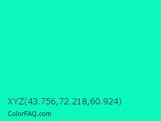 XYZ 43.756,72.218,60.924 Color is a normal cyan color and the nearest color is Bright Turquoise #08e8de. Hex code #0dfabf and RGB value is rgb(13,250,191). In RGB color space, this color is composed of 5% red, 98% green, 75% blue, In CMYK color space, this color is composed of 95% cyan, 0% magenta, 24% yellow , 2% black , In HSL color space, this color has a hue angle of 165° , 96% saturation and 52% lightness.