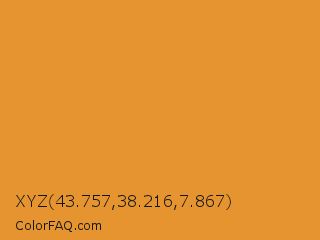 XYZ 43.757,38.216,7.867 Color is a normal orange color and the nearest color is Fire Bush #e89928. Hex code #e69430 and RGB value is rgb(230,148,48). In RGB color space, this color is composed of 90% red, 58% green, 19% blue, In CMYK color space, this color is composed of 0% cyan, 36% magenta, 79% yellow , 10% black , In HSL color space, this color has a hue angle of 33° , 78% saturation and 55% lightness.