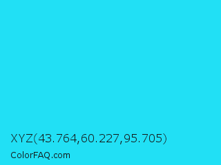 XYZ 43.764,60.227,95.705 Color is a normal cyan color and the nearest color is Loeen #15f2fd. Hex code #21e0f5 and RGB value is rgb(33,224,245). In RGB color space, this color is composed of 13% red, 88% green, 96% blue, In CMYK color space, this color is composed of 87% cyan, 9% magenta, 0% yellow , 4% black , In HSL color space, this color has a hue angle of 186° , 91% saturation and 55% lightness.