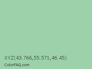 XYZ 43.766,55.571,46.45 Color is a light green color and the nearest color is Turquoise Green #a0d6b4. Hex code #9cd1aa and RGB value is rgb(156,209,170). In RGB color space, this color is composed of 61% red, 82% green, 67% blue, In CMYK color space, this color is composed of 25% cyan, 0% magenta, 19% yellow , 18% black , In HSL color space, this color has a hue angle of 136° , 37% saturation and 72% lightness.