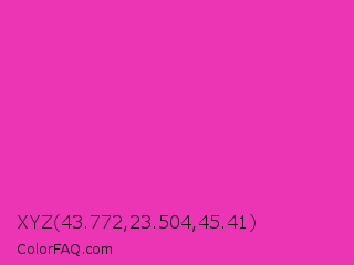 XYZ 43.772,23.504,45.41 Color is a normal magenta color and the nearest color is Frostbite #e936a7. Hex code #eb35b4 and RGB value is rgb(235,53,180). In RGB color space, this color is composed of 92% red, 21% green, 71% blue, In CMYK color space, this color is composed of 0% cyan, 77% magenta, 23% yellow , 8% black , In HSL color space, this color has a hue angle of 318° , 82% saturation and 56% lightness.
