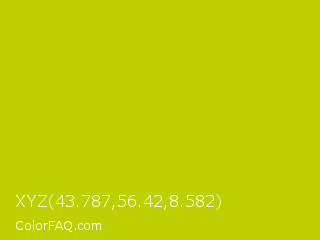 XYZ 43.787,56.42,8.582 Color is a normal yellow color and the nearest color is Rio Grande #bbd009. Hex code #bdd100 and RGB value is rgb(189,209,0). In RGB color space, this color is composed of 74% red, 82% green, 0% blue, In CMYK color space, this color is composed of 10% cyan, 0% magenta, 100% yellow , 18% black , In HSL color space, this color has a hue angle of 66° , 100% saturation and 41% lightness.