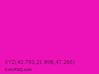 XYZ 43.793,21.898,47.266 Color is a normal magenta color and the nearest color is Shocking Pink #fc0fc0. Hex code #ed12b8 and RGB value is rgb(237,18,184). In RGB color space, this color is composed of 93% red, 7% green, 72% blue, In CMYK color space, this color is composed of 0% cyan, 92% magenta, 22% yellow , 7% black , In HSL color space, this color has a hue angle of 315° , 86% saturation and 50% lightness.