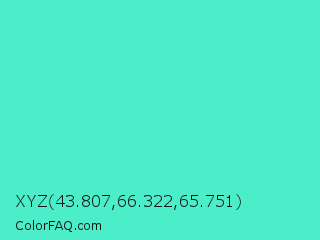 XYZ 43.807,66.322,65.751 Color is a light cyan color and the nearest color is Turquoise #40e0d0. Hex code #4cedc9 and RGB value is rgb(76,237,201). In RGB color space, this color is composed of 30% red, 93% green, 79% blue, In CMYK color space, this color is composed of 68% cyan, 0% magenta, 15% yellow , 7% black , In HSL color space, this color has a hue angle of 167° , 82% saturation and 61% lightness.