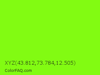 XYZ 43.812,73.784,12.505 Color is a normal green color and the nearest color is Chartreuse #7fff00. Hex code #82fb12 and RGB value is rgb(130,251,18). In RGB color space, this color is composed of 51% red, 98% green, 7% blue, In CMYK color space, this color is composed of 48% cyan, 0% magenta, 93% yellow , 2% black , In HSL color space, this color has a hue angle of 91° , 97% saturation and 53% lightness.