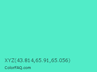 XYZ 43.814,65.91,65.056 Color is a light cyan color and the nearest color is Turquoise #40e0d0. Hex code #51ecc8 and RGB value is rgb(81,236,200). In RGB color space, this color is composed of 32% red, 93% green, 78% blue, In CMYK color space, this color is composed of 66% cyan, 0% magenta, 15% yellow , 7% black , In HSL color space, this color has a hue angle of 166° , 80% saturation and 62% lightness.