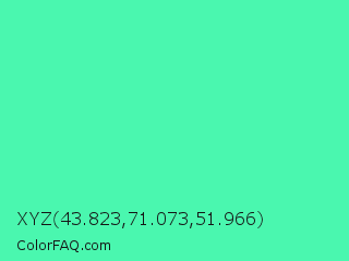 XYZ 43.823,71.073,51.966 Color is a light green color and the nearest color is Eucalyptus #44d7a8. Hex code #4af7af and RGB value is rgb(74,247,175). In RGB color space, this color is composed of 29% red, 97% green, 69% blue, In CMYK color space, this color is composed of 70% cyan, 0% magenta, 29% yellow , 3% black , In HSL color space, this color has a hue angle of 155° , 92% saturation and 63% lightness.
