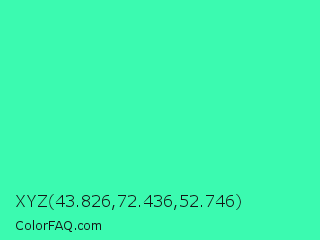 XYZ 43.826,72.436,52.746 Color is a light green color and the nearest color is Eucalyptus #44d7a8. Hex code #3bfab0 and RGB value is rgb(59,250,176). In RGB color space, this color is composed of 23% red, 98% green, 69% blue, In CMYK color space, this color is composed of 76% cyan, 0% magenta, 30% yellow , 2% black , In HSL color space, this color has a hue angle of 157° , 95% saturation and 61% lightness.