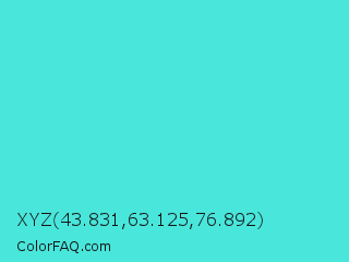 XYZ 43.831,63.125,76.892 Color is a normal cyan color and the nearest color is Turquoise #40e0d0. Hex code #49e6db and RGB value is rgb(73,230,219). In RGB color space, this color is composed of 29% red, 90% green, 86% blue, In CMYK color space, this color is composed of 68% cyan, 0% magenta, 5% yellow , 10% black , In HSL color space, this color has a hue angle of 176° , 76% saturation and 59% lightness.