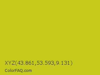 XYZ 43.861,53.593,9.131 Color is a normal yellow color and the nearest color is Key Lime Pie #bfc921. Hex code #c4c91c and RGB value is rgb(196,201,28). In RGB color space, this color is composed of 77% red, 79% green, 11% blue, In CMYK color space, this color is composed of 2% cyan, 0% magenta, 86% yellow , 21% black , In HSL color space, this color has a hue angle of 62° , 76% saturation and 45% lightness.