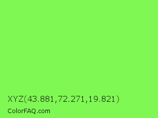 XYZ 43.881,72.271,19.821 Color is a light green color and the nearest color is Kiwi #8ee53f. Hex code #7ff853 and RGB value is rgb(127,248,83). In RGB color space, this color is composed of 50% red, 97% green, 33% blue, In CMYK color space, this color is composed of 49% cyan, 0% magenta, 67% yellow , 3% black , In HSL color space, this color has a hue angle of 104° , 92% saturation and 65% lightness.