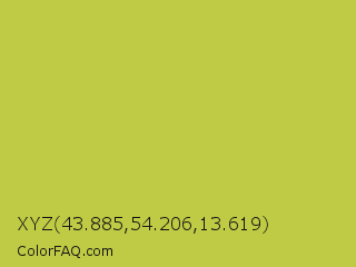 XYZ 43.885,54.206,13.619 Color is a normal yellow color and the nearest color is Turmeric #cabb48. Hex code #bfcb44 and RGB value is rgb(191,203,68). In RGB color space, this color is composed of 75% red, 80% green, 27% blue, In CMYK color space, this color is composed of 6% cyan, 0% magenta, 67% yellow , 20% black , In HSL color space, this color has a hue angle of 65° , 56% saturation and 53% lightness.
