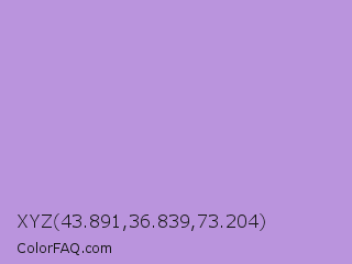 XYZ 43.891,36.839,73.204 Color is a light purple color and the nearest color is Bright Lavender #bf94e4. Hex code #ba94dd and RGB value is rgb(186,148,221). In RGB color space, this color is composed of 73% red, 58% green, 87% blue, In CMYK color space, this color is composed of 16% cyan, 33% magenta, 0% yellow , 13% black , In HSL color space, this color has a hue angle of 271° , 52% saturation and 72% lightness.