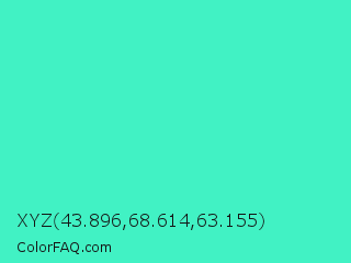 XYZ 43.896,68.614,63.155 Color is a normal cyan color and the nearest color is Turquoise #40e0d0. Hex code #41f2c4 and RGB value is rgb(65,242,196). In RGB color space, this color is composed of 25% red, 95% green, 77% blue, In CMYK color space, this color is composed of 73% cyan, 0% magenta, 19% yellow , 5% black , In HSL color space, this color has a hue angle of 164° , 87% saturation and 60% lightness.