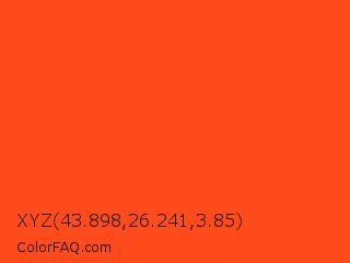 XYZ 43.898,26.241,3.85 Color is a normal red color and the nearest color is Orioles Orange #fb4f14. Hex code #ff4a1c and RGB value is rgb(255,74,28). In RGB color space, this color is composed of 100% red, 29% green, 11% blue, In CMYK color space, this color is composed of 0% cyan, 71% magenta, 89% yellow , 0% black , In HSL color space, this color has a hue angle of 12° , 100% saturation and 55% lightness.
