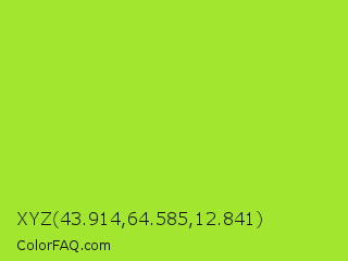 XYZ 43.914,64.585,12.841 Color is a normal green color and the nearest color is Green Lizard #a7f432. Hex code #a3e62f and RGB value is rgb(163,230,47). In RGB color space, this color is composed of 64% red, 90% green, 18% blue, In CMYK color space, this color is composed of 29% cyan, 0% magenta, 80% yellow , 10% black , In HSL color space, this color has a hue angle of 82° , 79% saturation and 54% lightness.