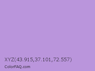 XYZ 43.915,37.101,72.557 Color is a light purple color and the nearest color is Bright Lavender #bf94e4. Hex code #ba95dc and RGB value is rgb(186,149,220). In RGB color space, this color is composed of 73% red, 58% green, 86% blue, In CMYK color space, this color is composed of 15% cyan, 32% magenta, 0% yellow , 14% black , In HSL color space, this color has a hue angle of 271° , 50% saturation and 72% lightness.