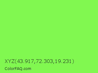 XYZ 43.917,72.303,19.231 Color is a light green color and the nearest color is Kiwi #8ee53f. Hex code #80f850 and RGB value is rgb(128,248,80). In RGB color space, this color is composed of 50% red, 97% green, 31% blue, In CMYK color space, this color is composed of 48% cyan, 0% magenta, 68% yellow , 3% black , In HSL color space, this color has a hue angle of 103° , 92% saturation and 64% lightness.