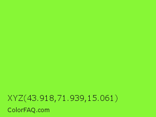 XYZ 43.918,71.939,15.061 Color is a normal green color and the nearest color is Spring Frost #87ff2a. Hex code #87f736 and RGB value is rgb(135,247,54). In RGB color space, this color is composed of 53% red, 97% green, 21% blue, In CMYK color space, this color is composed of 45% cyan, 0% magenta, 78% yellow , 3% black , In HSL color space, this color has a hue angle of 95° , 92% saturation and 59% lightness.