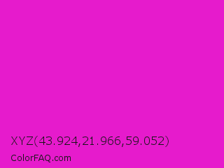 XYZ 43.924,21.966,59.052 Color is a normal magenta color and the nearest color is Hot Magenta #ff1dce. Hex code #e61bcc and RGB value is rgb(230,27,204). In RGB color space, this color is composed of 90% red, 11% green, 80% blue, In CMYK color space, this color is composed of 0% cyan, 88% magenta, 11% yellow , 10% black , In HSL color space, this color has a hue angle of 308° , 80% saturation and 50% lightness.