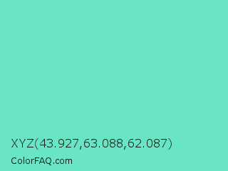 XYZ 43.927,63.088,62.087 Color is a light cyan color and the nearest color is Downy #6fd0c5. Hex code #6ae5c4 and RGB value is rgb(106,229,196). In RGB color space, this color is composed of 42% red, 90% green, 77% blue, In CMYK color space, this color is composed of 54% cyan, 0% magenta, 14% yellow , 10% black , In HSL color space, this color has a hue angle of 164° , 70% saturation and 66% lightness.