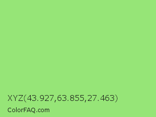 XYZ 43.927,63.855,27.463 Color is a light green color and the nearest color is Feijoa #9fdd8c. Hex code #96e577 and RGB value is rgb(150,229,119). In RGB color space, this color is composed of 59% red, 90% green, 47% blue, In CMYK color space, this color is composed of 34% cyan, 0% magenta, 48% yellow , 10% black , In HSL color space, this color has a hue angle of 103° , 68% saturation and 68% lightness.