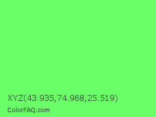 XYZ 43.935,74.968,25.519 Color is a light green color and the nearest color is Screamin Green #66ff66. Hex code #6afe69 and RGB value is rgb(106,254,105). In RGB color space, this color is composed of 42% red, 100% green, 41% blue, In CMYK color space, this color is composed of 58% cyan, 0% magenta, 59% yellow , 0% black , In HSL color space, this color has a hue angle of 120° , 99% saturation and 70% lightness.