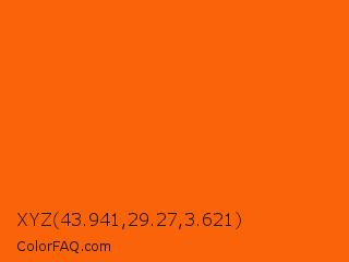 XYZ 43.941,29.27,3.621 Color is a normal orange color and the nearest color is Blaze Orange #ff6600. Hex code #fa630a and RGB value is rgb(250,99,10). In RGB color space, this color is composed of 98% red, 39% green, 4% blue, In CMYK color space, this color is composed of 0% cyan, 60% magenta, 96% yellow , 2% black , In HSL color space, this color has a hue angle of 22° , 96% saturation and 51% lightness.
