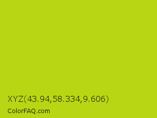 XYZ 43.94,58.334,9.606 Color is a normal yellow color and the nearest color is Fuego #bede0d. Hex code #b8d614 and RGB value is rgb(184,214,20). In RGB color space, this color is composed of 72% red, 84% green, 8% blue, In CMYK color space, this color is composed of 14% cyan, 0% magenta, 91% yellow , 16% black , In HSL color space, this color has a hue angle of 69° , 83% saturation and 46% lightness.